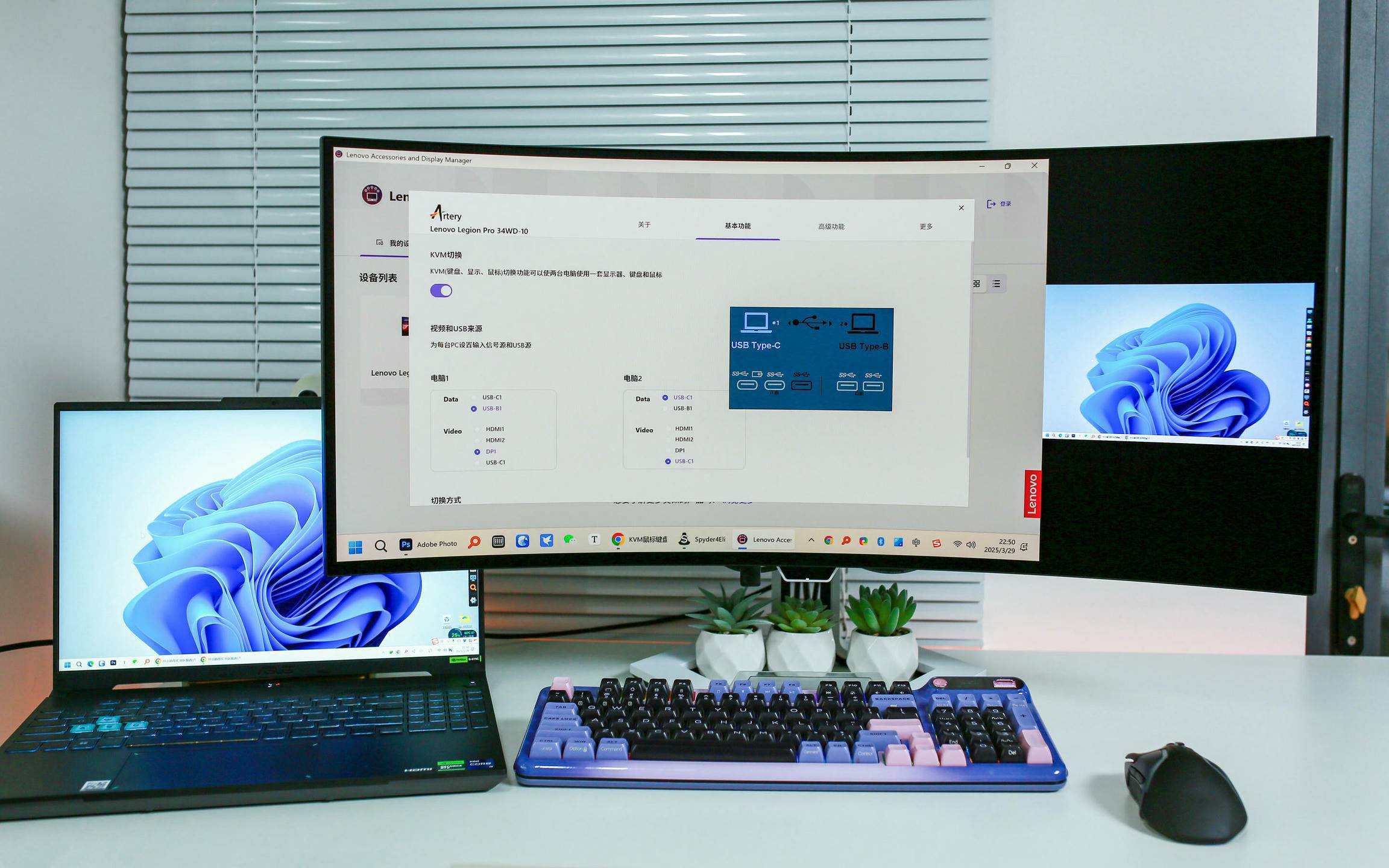 同时,KVM 切换能够利用一组键盘和鼠标节制两台电脑。屏幕一侧显示笔记本画面,